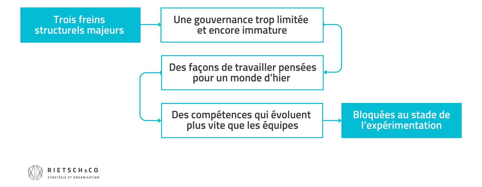 Le deuxième blocage est plus invisible. Les processus de travail eux-mêmes n’ont pas été repensés alors que l’IA ne se contente pas d’accélérer les tâches existantes : elle change la manière dont le travail doit être organisé.