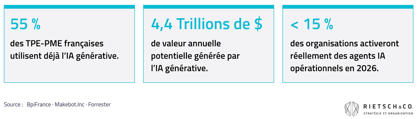 Mais… ce débat rate selon nous l’essentiel. Le véritable enjeu de l’IA générative n’est pas technologique. Il est organisationnel et stratégique.