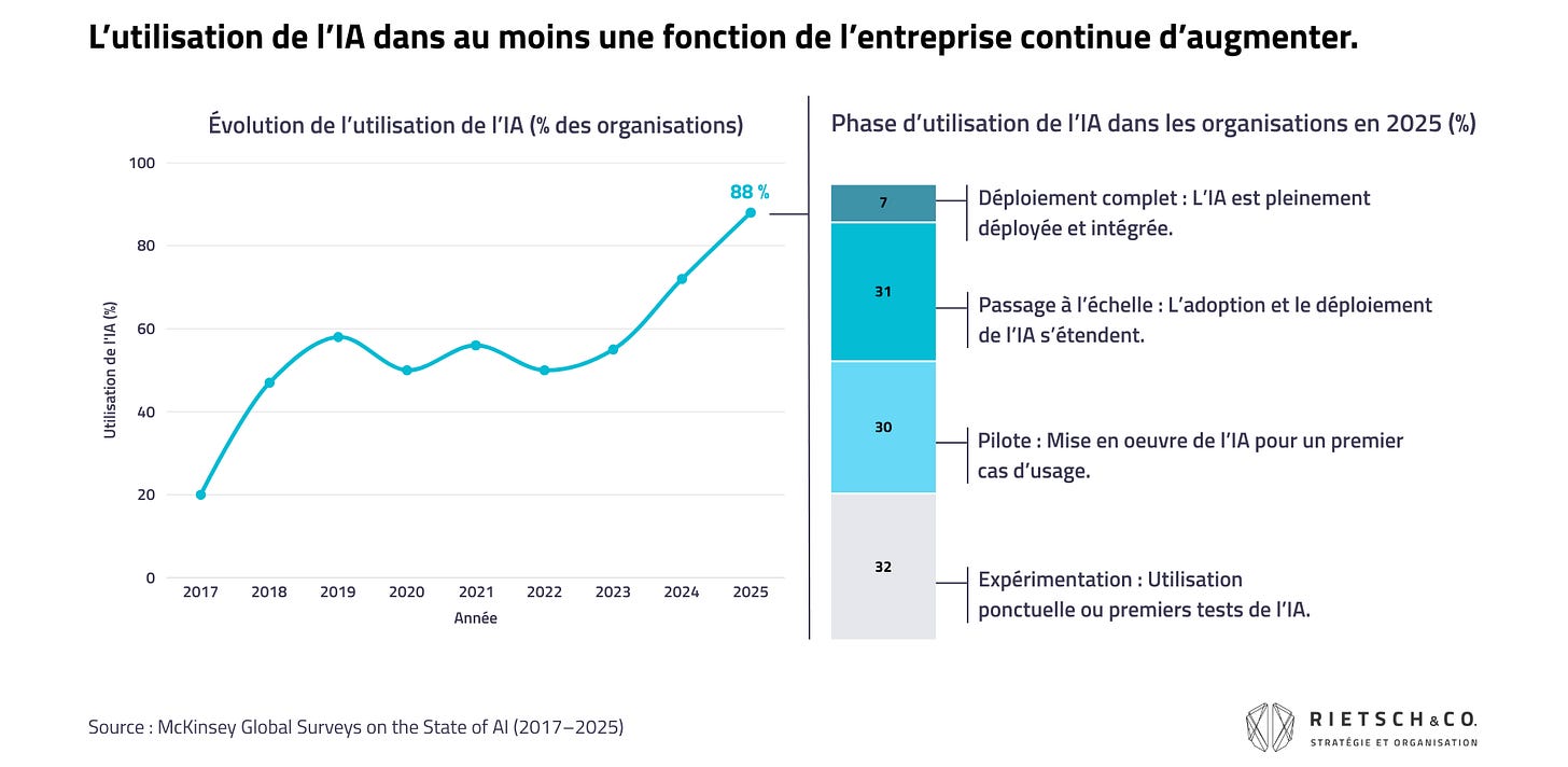 Les chiffres sont assez révélateurs : près de 90 % des organisations utilisent aujourd’hui l’IA dans au moins une fonction, mais seules une minorité réussissent à en tirer un impact réel sur la performance (LabSense).